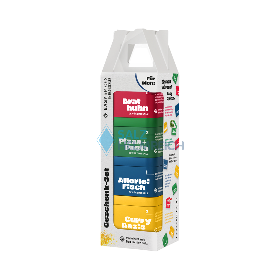 Das Easy Spices Geschenkset vereint vier beliebte Gewürzmischungen: Brathuhn, Pizza & Pasta, Allerlei Fisch und Curry Basis. Ideal zum Würzen, Verfeinern und Genießen – perfekt als Geschenk für Kochliebhaber oder Hobbyköche.